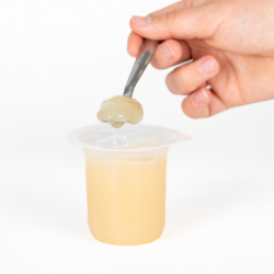 Une texture lisse et homogène, qui ne se fragmente pas en bouche et glisse lentement le long des muqueuses. Elle résiste à l’amylase salivaire (gomme de xanthane), thermostable de 3 à 37°C (en bouche).