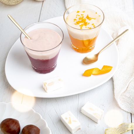 Eau, marrons 15%, sucre, crème (LAIT) 5%, concentré de jus de cassis 4%, concentré de jus de pomme, fibre d'agrume, huile de colza, farine de maïs, arôme naturel vanille, extraits végétaux (orange et romarin), conservateur : vinaigre tamponné en poudre, levure inactivée.